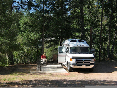 We recently bought this small motorhome to travel with the dogs in. I'm hoping that we will escape the heat more often next summer. We took it up to the pines of northern AZ this weekend. If you look closely, it appears that I am fenced in. Um, that would be for the pups who were too busy lounging on the beds inside. The van has all the comforts of home, but I think it needs a sampler or two hanging in there somewhere. Just saying...